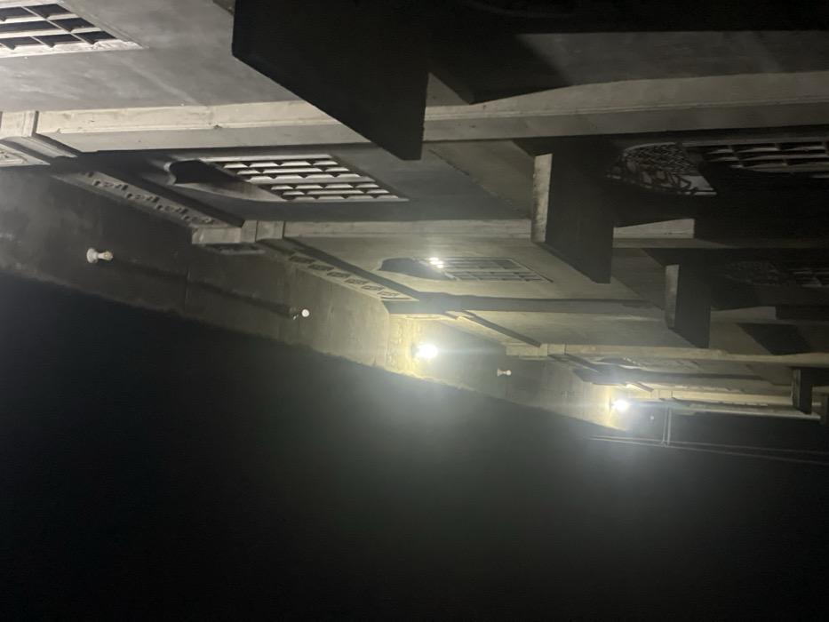 The image displays a multi-story building facade at night in Triengmeuduroe, Indonesia. The structure is constructed from a grey concrete or stucco material. Multiple incandescent-style light bulbs are suspended from the underside of a prominent cantilevered projection or balcony extending along the upper portion of the building, providing primary illumination to the facade. This lighting casts significant glare and highlights details such as decorative horizontal molding and vertical pilasters separating sections of the building. Visible windows feature recessed frames; some are arched with vertical grilles on a lower level, while others appear rectangular on an upper level. Small, flat, rectangular protrusions extend from the facade below some windows. The sky is dark, consistent with a nighttime setting. No individuals or active subjects are present within the frame.
