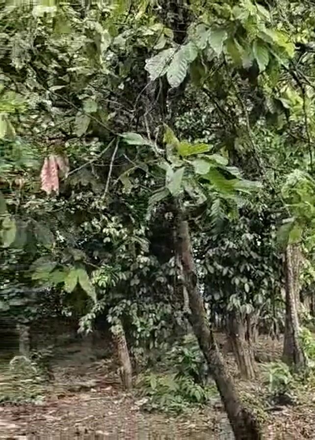 tropical forest scene, featuring dense foliage and several trees. The trees include cocoa trees, characterized by their broad green leaves and smooth trunks, as well as palm trees with their distinctive fronds. The undergrowth is lush with green plants, suggesting a moist environment. The camera pans slowly across the scene, providing a view of the forest's texture and depth. The lighting suggests it is daytime, with natural light filtering through the canopy.