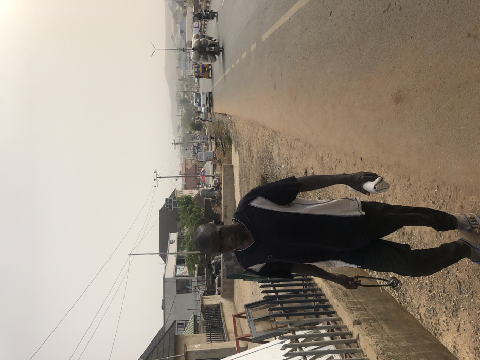 The image presents an outdoor street scene in Karu, Nigeria, under a hazy, light brown sky
