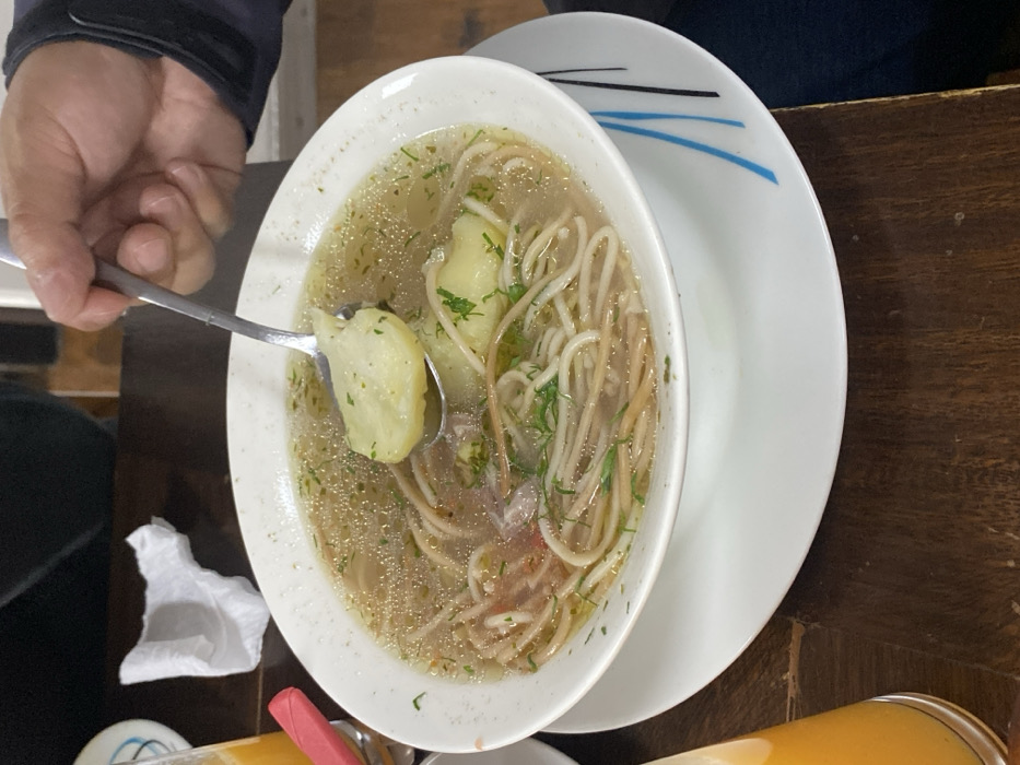 - "A person is eating soup from a white bowl, which is sitting on a white plate with blue stripes" by FM-33abC2, licensed under CC BY 4.0