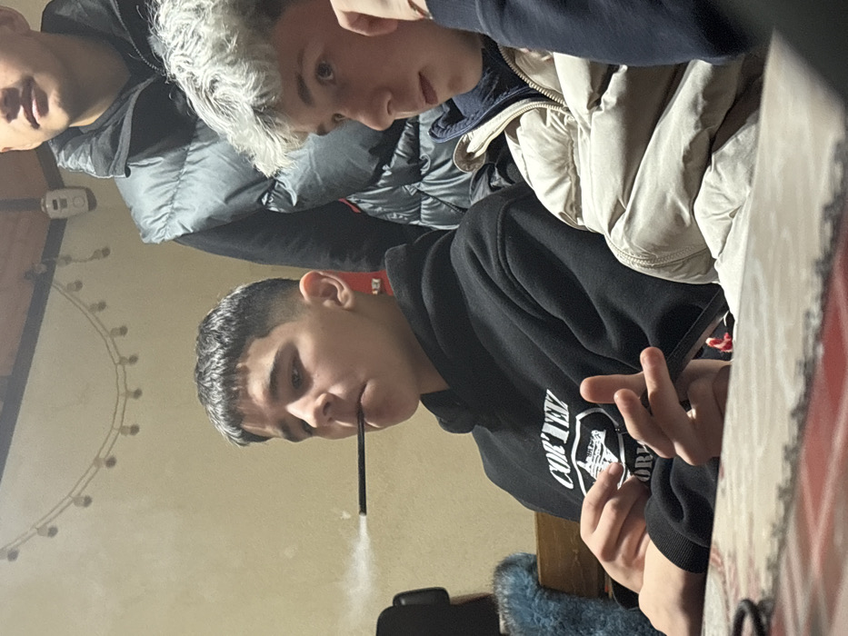 This image depicts an indoor scene with three individuals in what appears to be a casual, low-light environment. The specific location within Botevgrad, Bulgaria, cannot be determined from the visual information provided. In the foreground, a young male, estimated to be a teenager, occupies the left side of the frame. He has short, dark hair with a fade and is wearing a black hooded sweatshirt with a white graphic print on the chest. A dark, thin stick is held between his lips, from which a plume of white smoke emanates to his left. His right hand is visible, with fingers slightly spread, resting near a dark object on a patterned surface, possibly a tablecloth. His gaze is directed slightly to his right. To the right of the central figure, another young male, also appearing to be a teenager, is visible in profile. He has light, possibly dyed white or grey hair and is wearing a light-colored (beige/tan) puffer jacket over a dark garment. His left hand is raised towards his face. He is looking to his left, seemingly observing something or someone outside the frame. In the background, positioned behind the two foreground figures, the upper torso and lower face of a third male are partially visible. He has dark hair and is wearing a dark puffer vest over a dark long-sleeved top. His face is partially obscured and turned away from the camera. The background wall is light-colored, possibly cream or beige, and adorned with a string of decorative lights (fairy lights) hung in a double festoon pattern. A small white device is mounted on the wall above the background figure. A portion of a wooden bench or chair back is visible to the far left. The lighting is dim and artificial, creating a warm ambiance. The individuals are dressed in cold-weather attire.