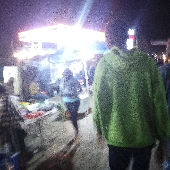 A person in a bright green hoodie and black pants stands with their back to the camera in a busy outdoor market at night. The market is brightly lit with overhead lights, casting a glare. Vendors and customers mill around stalls displaying various goods. A woman in a striped shirt and dark pants walks towards the stalls. The scene is somewhat grainy and appears to be captured in motion.