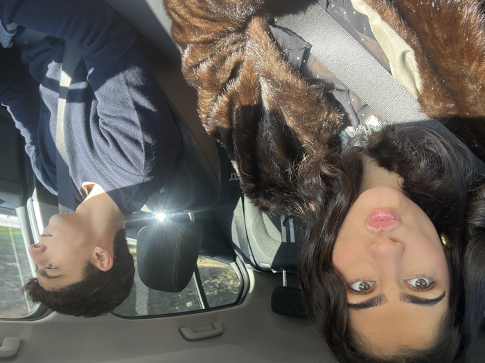 This image depicts two individuals inside a vehicle, located in Caminha, Portugal. In the foreground, a female occupies the front passenger seat, facing the camera for a selfie. She has dark, wavy hair and light brown eyes, with her lips pursed. She wears a dark brown, possibly fur, coat over a dark top with white polka dots and a lace collar. A golden hoop earring is visible on her left ear. A gray seatbelt crosses her chest. Behind her, in the rear passenger seat, a male is visible in profile, looking out the right-side window. He has short, dark, curly hair and wears a dark blue long-sleeved sweater, also secured by a gray seatbelt. Strong sunlight enters the vehicle from the right, creating prominent shadows and lens flares. The exterior background visible through the car windows includes trees and a road, indicating an outdoor, daytime setting.
