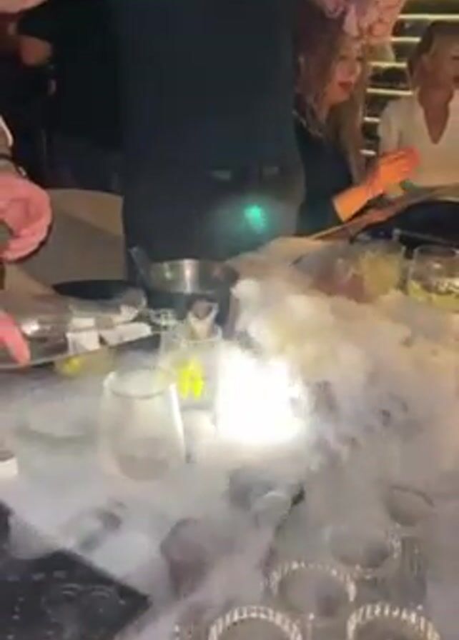 A brightly lit bar scene showcases several people, with two men in the foreground engaging in the creation of cocktails. One man, wearing a white shirt with the sleeves rolled up, holds a bottle, presumably an ingredient, while the other, clad in a black shirt, watches with a slight smile. The black-shirted man has short hair and tattoos visible on his arms. In front of them, a table is set with several empty glasses, an ice bucket, and ingredients like limes, all enveloped in a thick cloud of white vapor. Behind them, other individuals are seated at the bar, observing the cocktail preparation. The environment is dimly lit with warm tones, featuring a wine rack in the background. The overall atmosphere suggests a lively, upscale bar with a focus on the presentation of drinks.