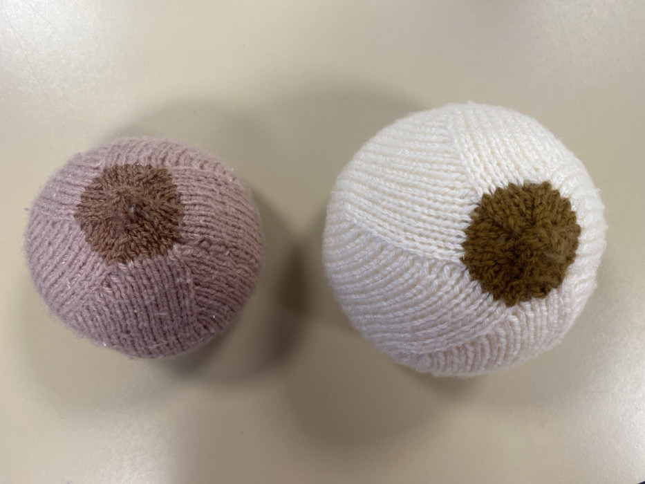 Two knitted spheres sit on a pale beige surface