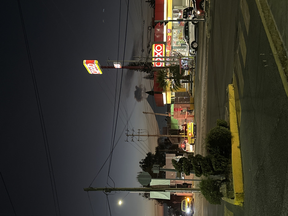 Night scene with a brightly lit Oxxo convenience store and a tall sign with the Oxxo logo