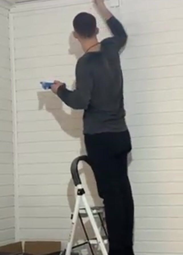 A young man is painting a white wall while standing on a small stepladder. He is wearing a dark gray long-sleeved shirt and black pants. The wall is made of white, horizontal panels. He is using a paintbrush and a small blue paint tray. The ceiling is also white and paneled. There is a black tarp on the floor with cardboard boxes underneath it. The man moves the paintbrush up and down, painting the trim where the wall meets the ceiling. He turns to look to his left momentarily.
