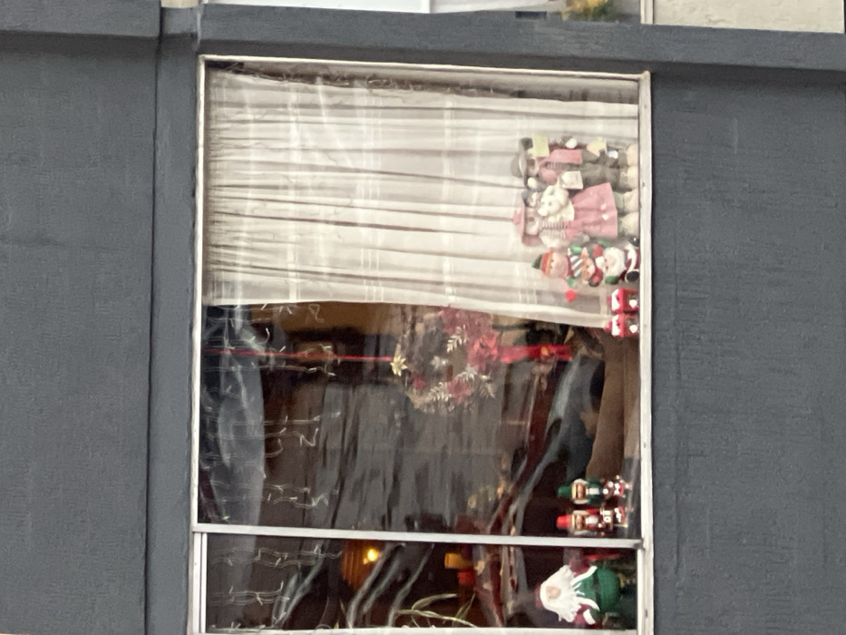 A window displays Christmas decorations behind a partially lowered sheer curtain