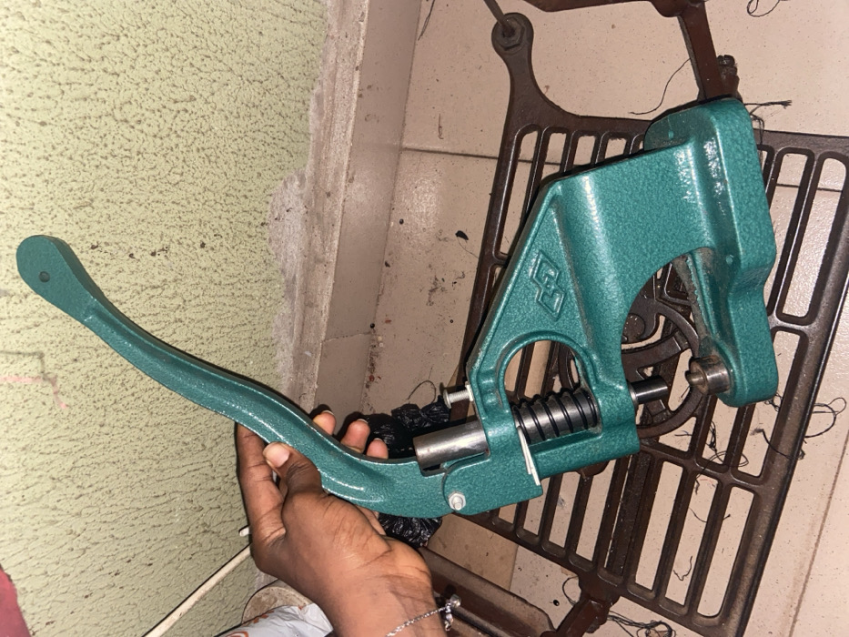 A green, lever-operated pressing machine sits atop an antique sewing machine frame with an intricate, patterned design. A hand supports the lever, which is slightly curved and ends in a rounded knob. The machine's main body features a spring mechanism and a small logo. The background includes a textured light-green wall and tiled flooring, creating a vintage or workshop aesthetic. A black trash bag is next to the device.