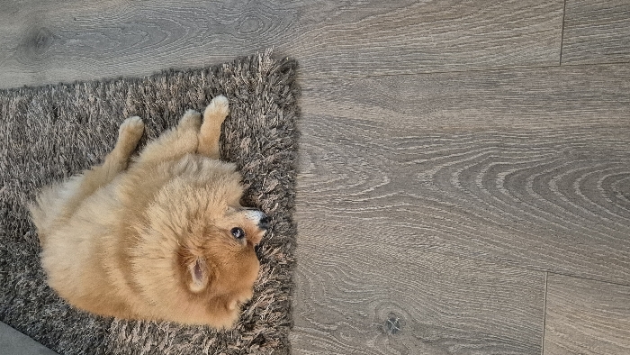 A small, light brown and orange-furred dog, consistent with a Pomeranian breed, is depicted resting in an indoor setting within the city of Sliven, Bulgaria. The dog is positioned prone on a dark grey, shaggy rug, occupying the upper left quadrant of the frame. Its head is slightly rotated to its left, facing forward, with its eyes open. The front paws are tucked under its body, and the hind legs extend rearward. Adjacent to the rug, along the right side and bottom of the image, is a light greyish-brown laminate or wood plank floor, exhibiting visible wood grain patterns. No other subjects or objects are present, and there are no discernible interactions or actions beyond the dog's resting state.