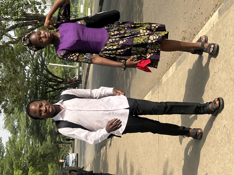 The scene depicts two young adults walking forward on a concrete sidewalk alongside an asphalt road in Ijanikin, Nigeria, under bright daylight