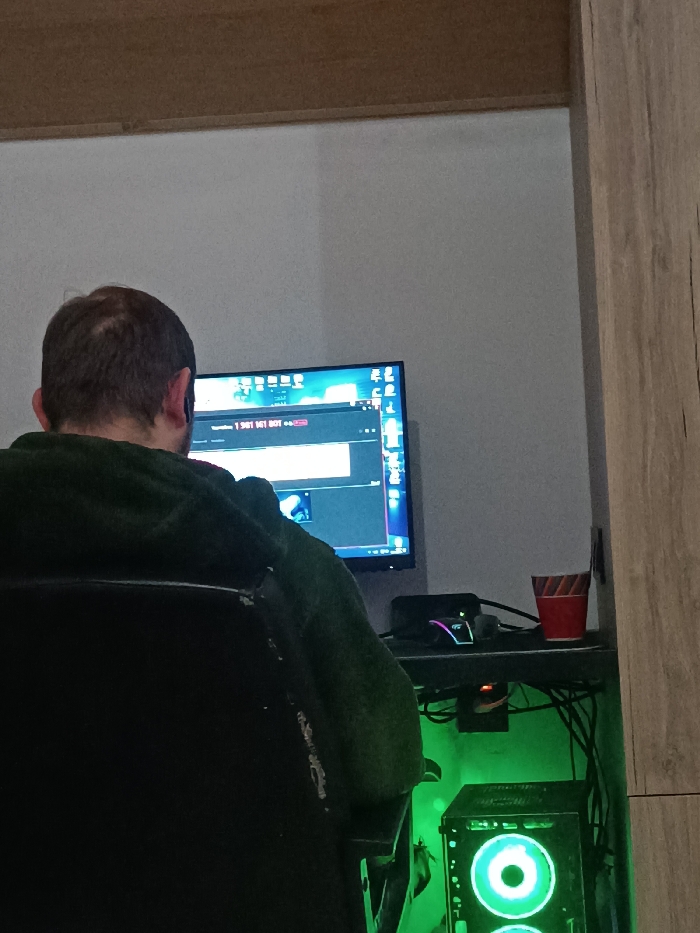 An individual is depicted from behind, seated at a computer workstation in an indoor environment in Tbilisi, Georgia. The subject is a male, wearing a dark green hooded sweatshirt, with short brown hair, and an in-ear headphone visible in his left ear. He is seated in a dark office chair, which shows visible wear and tearing on its upper backrest. The workstation consists of a dark-colored desk, supporting a computer monitor that displays a digital interface, possibly a video or streaming platform, with the alphanumeric sequence "1 981 141 801" prominently visible. A computer mouse with active LED lighting and a dark rectangular electronic device are also positioned on the desk, alongside various cables. Beneath the desk, a desktop computer tower illuminates with green LED fans and internal lighting. A red and white disposable cup rests on the right side of the desk. The immediate background features a light grey wall. A wooden trim runs horizontally along the top left portion of the frame, meeting a vertical wooden panel on the right side, which acts as a partial partition or furniture element.
