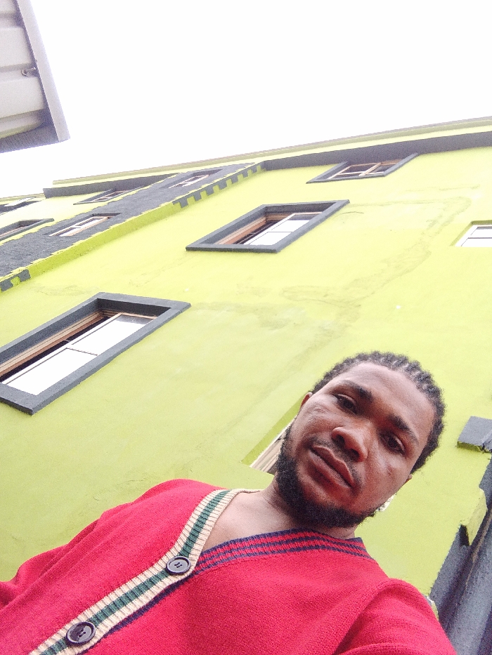 An upward-angled outdoor photograph taken in Alaiyabiagba, Nigeria, features a dark-skinned male subject in the foreground against a multi-story building