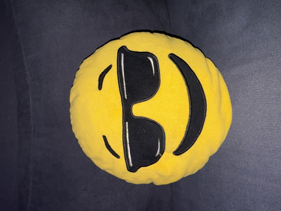 - "A yellow, circular plush pillow with a "cool" emoji design rests on a dark gray fabric surface" by FM-vKWxk2, licensed under CC BY 4.0