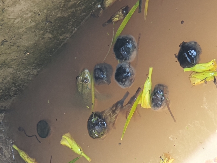 The scene, located in Kobura ward, Kenya, depicts a contained body of murky, reddish-brown water. Partially submerged within this water is one light green-brown frog, positioned towards the upper-middle left, with its head and upper back visible. Scattered throughout the water are approximately seven clusters of dark, spherical frogspawn or eggs. Various organic debris floats on the surface and within the water, including multiple yellow, bell-shaped floral petals, green leaf fragments, and small twigs or plant stems. A small, dark, worm-like object and a submerged, dark circular object are also present in the upper left quadrant. The water is bordered on the upper right by a grimy, possibly algae-covered, concrete or stone wall, indicating a basin or trough structure. No human presence or direct interactions are visible.