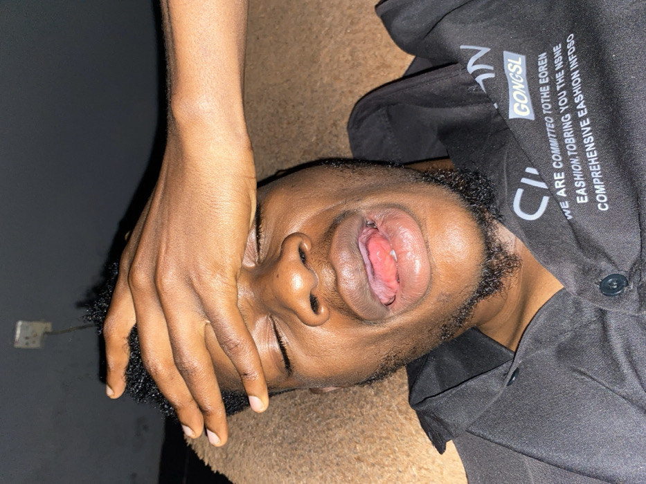 A male individual is depicted in a close-up, vertical shot, positioned as if reclining in an indoor setting, likely in the city of Udu, Nigeria. He presents with dark skin, short dark curly hair, and a dark beard. His eyes are closed, and his mouth is open, revealing the oral cavity. His right hand is placed across his forehead. He wears a black collared shirt with two buttons visible, featuring white text that includes "GONGSL" and partial phrases such as "WE ARE COMMITTED TO THE EOREN," "EASHION. TO BRING YOU THE NSNE," and "COMPREHENSIVE EASHION INFO SO." The subject rests on a brown, textured surface. In the upper left background, a light-colored electrical wall outlet with an attached cord is visible against a dark wall or ceiling. The scene appears dimly lit.