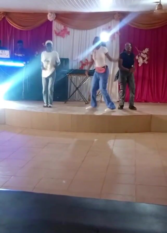 three individuals on a slightly raised stage with a red and gold curtain backdrop, dancing in what appears to be an event hall or auditorium