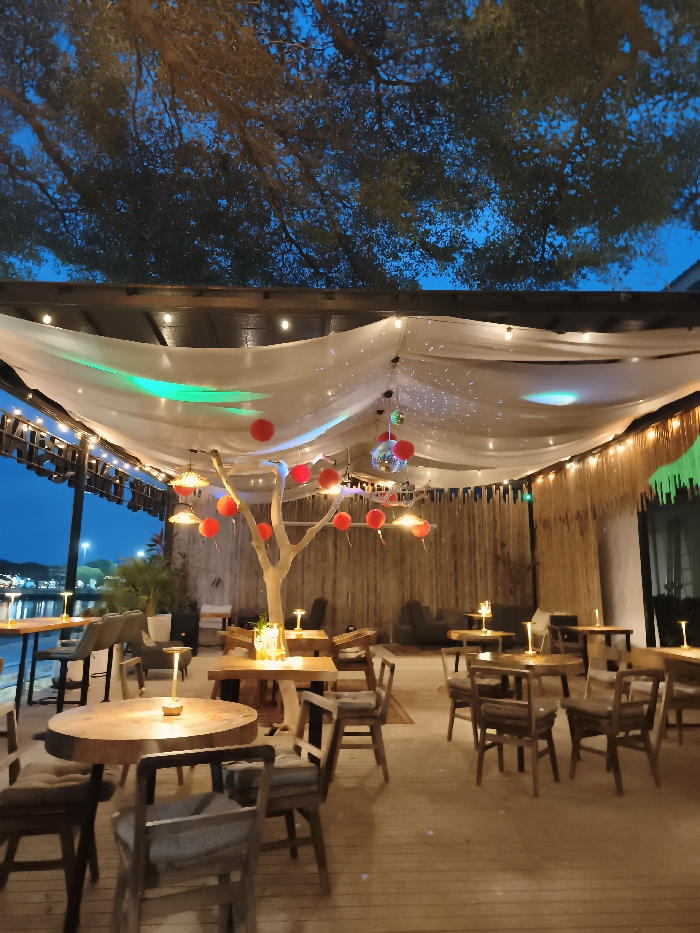 The image displays an unoccupied outdoor or semi-outdoor bar or restaurant space situated in Baan Chaweng, Thailand, depicted at dusk or early night. Overhead, a dark blue sky is visible through the dense, silhouetted foliage of a large tree. Beneath this, a white fabric canopy is suspended, illuminated by numerous string lights and several hanging disco ball ornaments, with green and blue light projections visible on the fabric. The floor is wooden decking. Centrally positioned is a prominent, light-colored, stylized tree structure adorned with multiple red spherical lanterns and smaller, possibly gold-toned, decorations. Various seating configurations are arranged throughout the area: - To the left, a long, elevated wooden bar table with gray high-backed stools faces a body of water, where distant lights are visible on a far shoreline. - Across the main floor, numerous wooden tables, both round and square, are arranged, each featuring a small, glowing, portable lamp. These are accompanied by matching wooden chairs fitted with light-colored cushions. - Towards the rear right, a darker lounge seating area is visible against a wall composed of vertical bamboo or thin wooden poles, which spans the right side of the venue and incorporates additional decorative elements at its top. No individuals are present within the scene, and no actions or interactions are depicted. The environment is primarily illuminated by artificial lights emanating from the table lamps, string lights, and reflected colored lights.