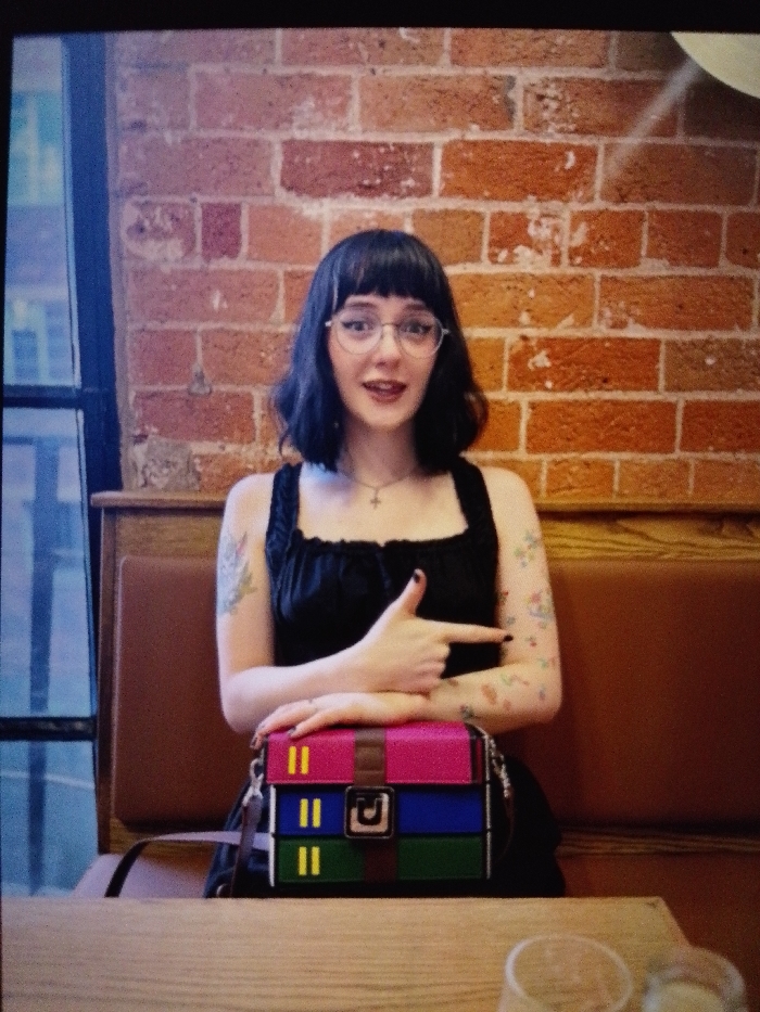 A female subject is seated at a light-colored wooden table indoors. She has dark, shoulder-length hair with bangs, wears round wire-frame glasses, and a black square-necked sleeveless top. A silver-colored cross pendant is visible around her neck. Tattoos are present on both arms: a floral design on the upper left arm, and multiple small, colorful designs on the right forearm. Her mouth is slightly open, and she is looking directly forward. Her left arm rests on the table, with her right hand forming a finger-gun gesture pointed to her right. A multi-colored rectangular handbag, featuring horizontal sections of pink, blue, and dark green, each with two yellow vertical bars, is on the table in front of her. The blue section includes a central silver-colored buckle. A brown strap is attached to the bag. To the right on the table, two partially visible clear glasses are present, one containing a light-colored beverage. The background consists of a reddish-brown brick wall. A dark-framed window or glass panel is visible on the far left. The subject is seated on brown upholstered booth-style seating. The scene is an unspecified indoor establishment in Lares, United States of America.