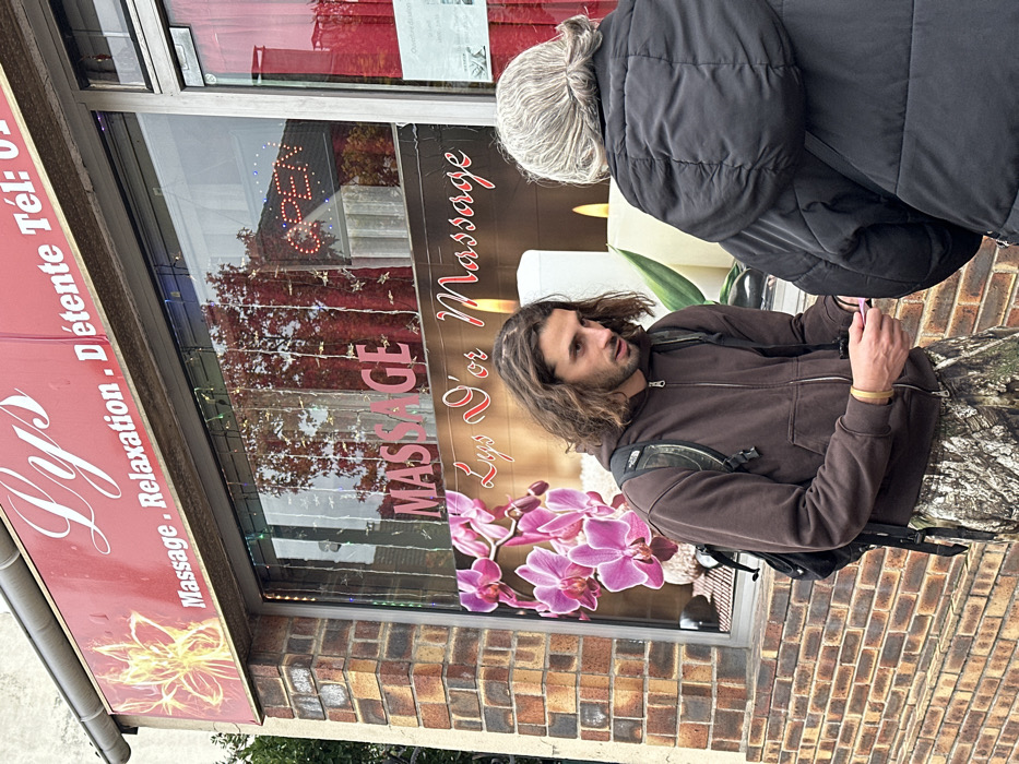 The image depicts an outdoor scene in Saint-Gratien, France, in front of a commercial establishment named "Lys." The building has a brick facade on the lower section, transitioning to an upper section with a red sign displaying "Lys" in white script, along with "Massage . Relaxation . Détente" and a telephone number. A yellow, stylized floral emblem is present on the left side of the red sign. Two individuals are present on a sidewalk directly in front of the building's large display window. 1. A male subject with long, dark, curly hair and a beard stands on the left. He is wearing a dark brown zippered hoodie, camouflage-patterned pants, and a black backpack. A light-colored band is visible on his right wrist. He is holding a small, light-colored object, possibly a card or paper, in his right hand and is oriented towards the second individual, appearing to engage in an interaction. His gaze is directed downwards and to the right. 2. An older female subject is positioned with her back mostly to the camera, partially obscuring the male's right side. She has gray hair pulled back and is wearing a dark, possibly black, padded jacket. Her posture suggests she is facing the male subject. The display window behind the individuals features large white text spelling "MASSAGE" and "Lys d'or Massage." Below this, a large image background includes vibrant pink orchids and large white candles with illuminated wicks. Reflections in the window show overhead structures and autumnal-colored trees. An illuminated "OPEN" sign is visible as a reflection in the upper right portion of the window. The overall scene suggests a casual street encounter in front of a massage and relaxation parlor.