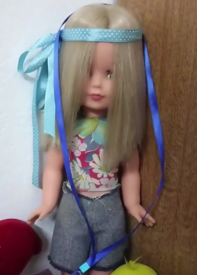 A doll with blonde hair is seen standing next to a wall and a wooden surface. The doll is wearing a blue headband with white polka dots, a floral top, and denim shorts. A blue ribbon hangs from the headband. There's a red plush toy on the left, a yellow plush toy on the right, and a purple box with text on it. The background is out of focus.