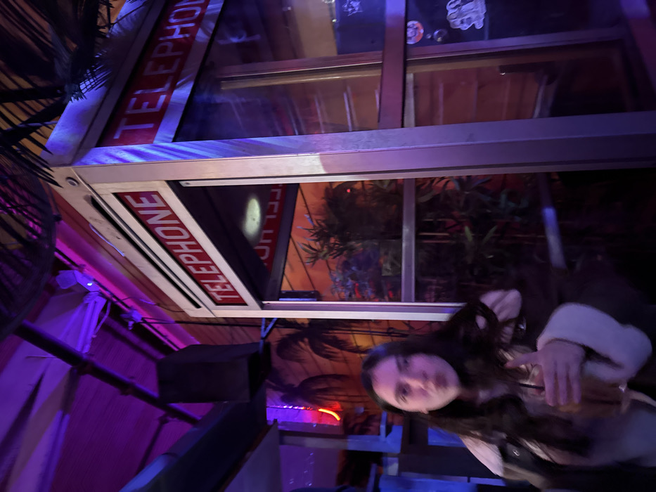 A tilted, low-angle shot shows a woman with long, dark hair holding a drink in a dimly lit space. Behind her is a telephone booth with the word "TELEPHONE" in red letters. The booth appears to be indoors, with a jungle-themed mural visible inside. The space has a mix of purple and dim lighting, contributing to a vibrant, almost dreamlike atmosphere. Some palm fronds and pipes are visible in the foreground, adding to the unique ambiance.