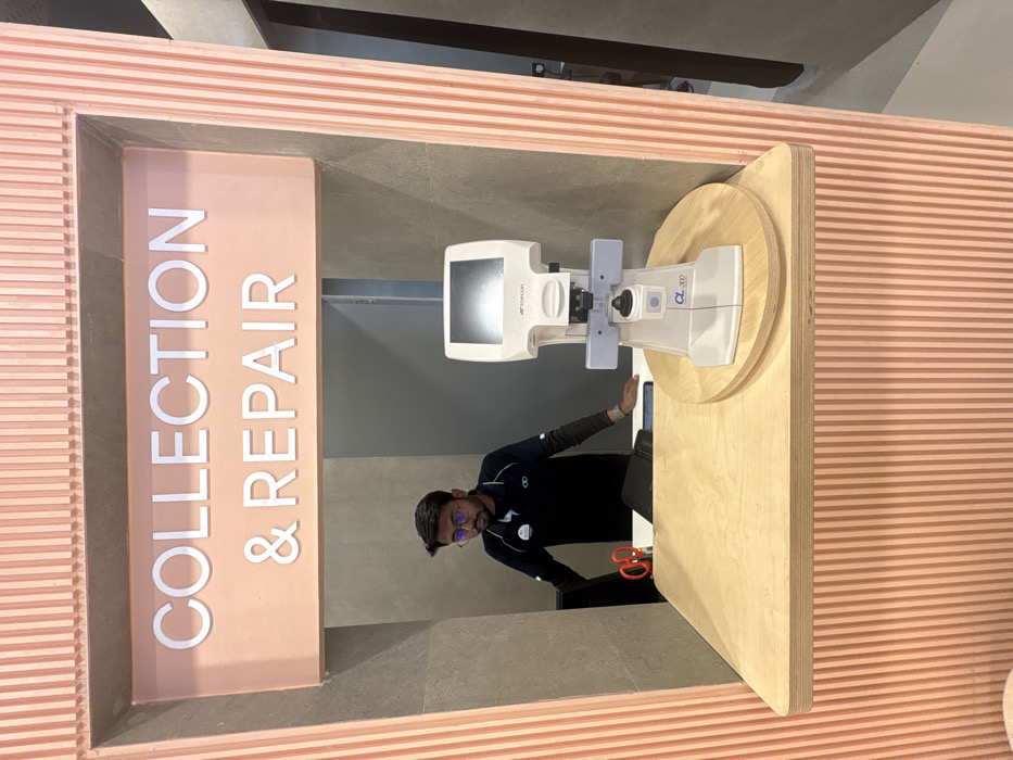 The image depicts a "COLLECTION & REPAIR" counter at an optical establishment in South Dumdum, India