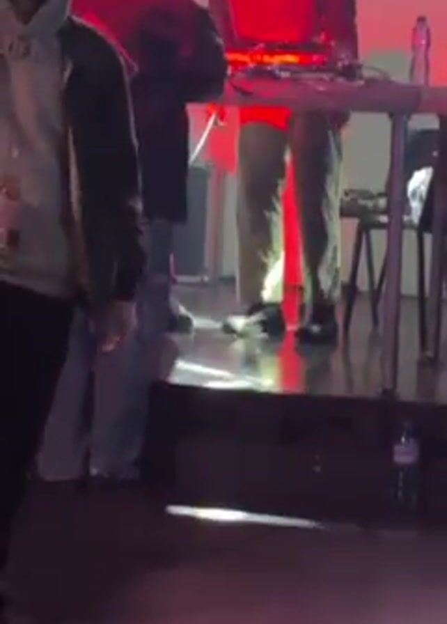 A video captures a scene at what appears to be a live music event or a club. Three people are on a low stage behind a metal table with electronic equipment on it, possibly DJ equipment. The person on the right wears light trousers, a dark top, and black shoes and stands at the table, presumably operating the equipment. To the left, a person wears baggy blue jeans with cargo pockets and a dark jacket with a large, white logo on the back. To the left of that person is another, partially obscured. In the foreground, a person walks across the camera’s field of view, holding a bottle and wearing black pants and a dark jacket over a gray hoodie. The lighting is predominantly red, with a bright spotlight shining from above. The music is loud and electronic.
