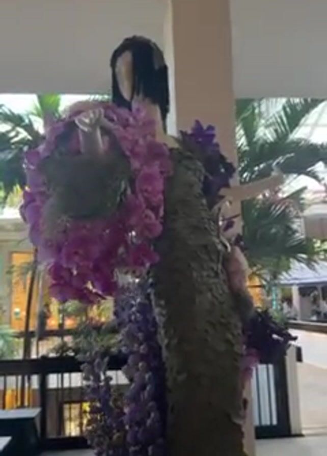 n indoor scene with a flower-covered mannequin and a fountain. The mannequin is covered in green foliage and purple orchids, with black hair. The fountain is a square pool with multiple jets of water shooting upwards. Beyond the fountain, palm trees and a glimpse of a building can be seen through an open walkway. A sign is visible next to the fountain, and the overall setting appears to be a well-lit, indoor mall or atrium.