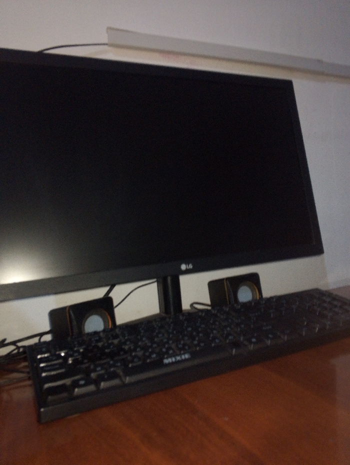 A black LG monitor dominates the frame, standing on a brown wooden desk. A black keyboard with visible "MIXIE" lettering rests in front of the monitor, flanked by small, dark speakers on either side of the monitor's stand. A thin white light fixture is mounted on the wall above the monitor. The background is a plain white wall. The scene is lit by ambient light, casting a subtle reflection on the monitor screen.