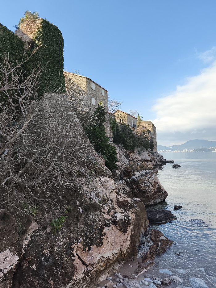 The image depicts a coastal scene in Sveti Stefan, Montenegro, featuring stone buildings constructed directly onto rocky cliffs overlooking calm seawater