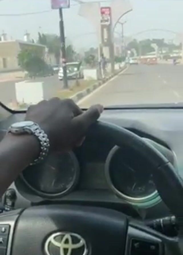 A person is driving a car, the left hand is visible on the steering wheel, which bears the Toyota logo. The car is moving down a road in a sunny, possibly dusty, environment. There are light-colored buildings, palm trees, and other vehicles visible in the distance. The road has a center median and appears to be well-maintained. The dashboard of the car is visible, including the speedometer and other gauges.