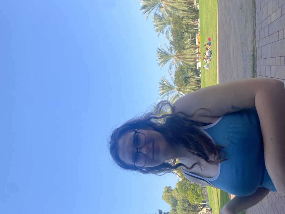 The image portrays an outdoor scene under a clear blue sky, consistent with the Tel Aviv University campus in Tel Aviv, Israel. In the foreground, positioned left of center, a female individual with long, wavy brown hair, black-rimmed glasses, and a light blue ribbed tank top with white trim is visible. She exhibits a neutral expression with a slight smile, looking towards the camera. A small tattoo is present on her upper left arm. She is situated on a paved surface composed of reddish-brown and gray interlocking pavers. In the midground, to the right, a group of approximately 6-8 individuals are casually seated on a large, vibrant green grassy slope, appearing to be interacting. Behind this group and across the midground, a prominent line of tall palm trees is visible, with additional green trees and building structures partially discernible in the far left background. A dark gray pathway or road separates the foreground paved area from the grassy expanse.