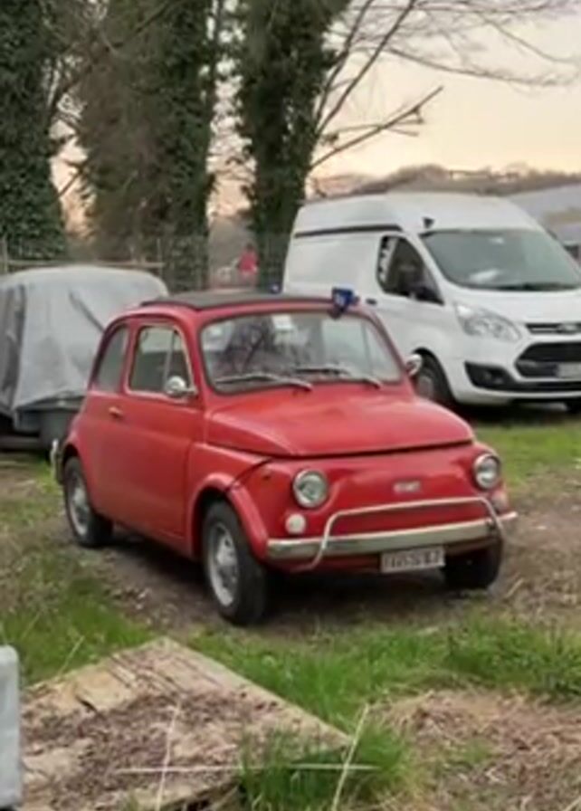 red Fiat 500 parked on a grassy patch next to a white Ford Transit van