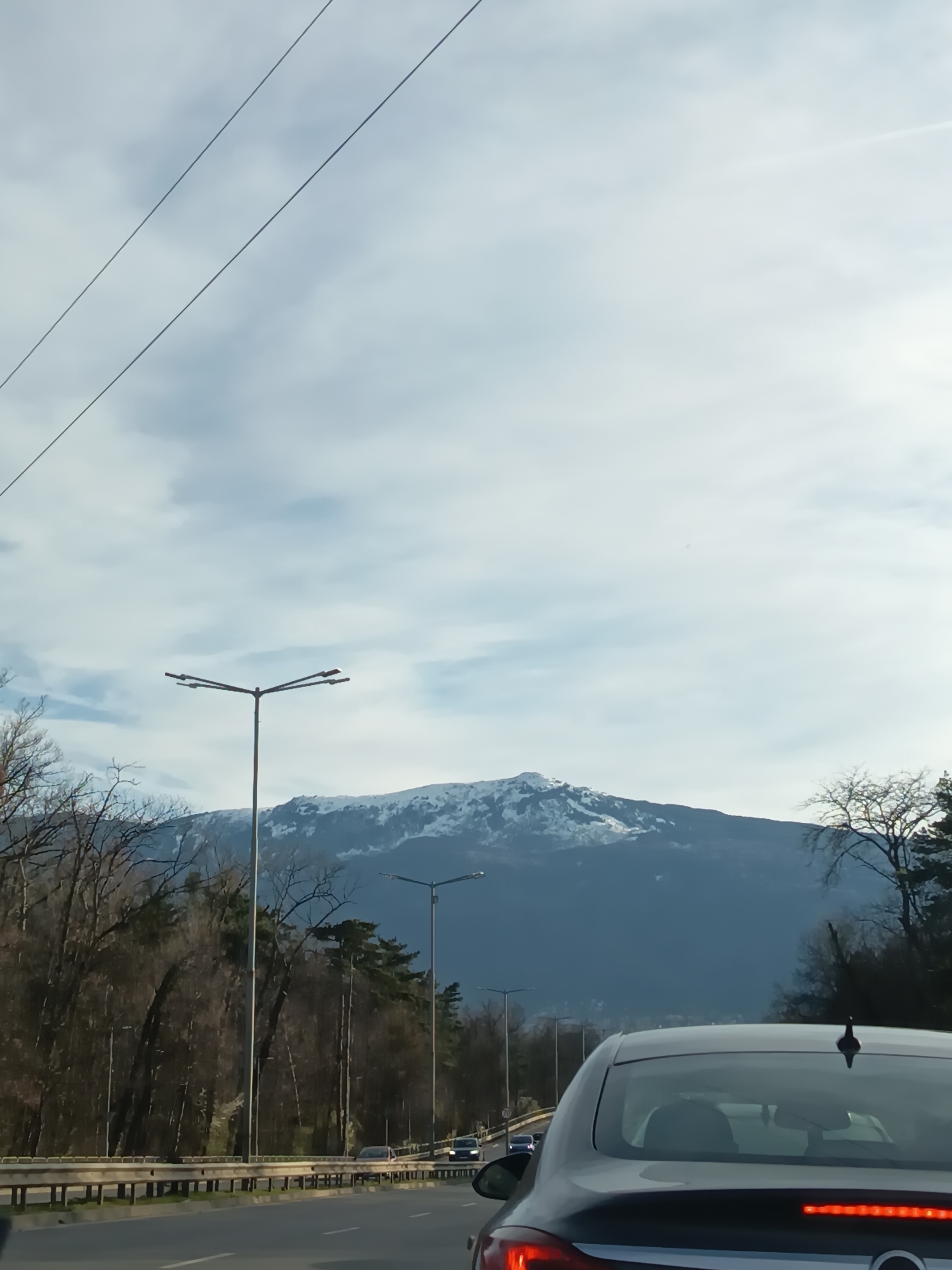 The image captures a view from a car traveling on a road in Sofia, Bulgaria. A prominent snow-capped mountain dominates the horizon. Streetlights line the road, flanked by trees. The sky is overcast with patches of blue. The rear of a black Opel Insignia is visible in the foreground. Other vehicles are visible on the road ahead. The location appears to be on the periphery of Sofia, heading towards or away from the Vitosha mountain.