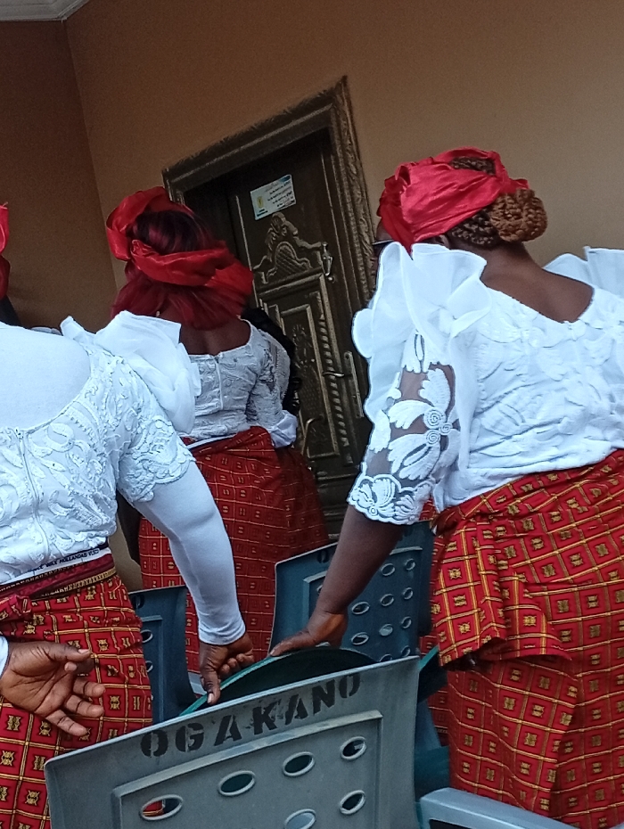 Three women in traditional attire stand near chairs, their backs to the viewer. They wear white blouses with lace and red patterned skirts. Red head wraps adorn their heads. The chairs, stacked together, have "OGAKANO" printed on them. In the background, a door with ornate molding and a small sign is visible. The image is captured at eye level in natural light, providing a close-up perspective of the subjects and their clothing.
