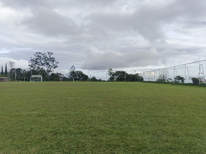 A wide shot captures a grassy soccer field under a cloudy sky. The field, predominantly green, stretches towards a net fence bordering the horizon. Trees are sporadically dispersed behind the fence. A soccer goal is visible on the left side of the field, accompanied by a small structure nearby. The sky is overcast with gray clouds, suggesting a potentially gloomy or rainy day.