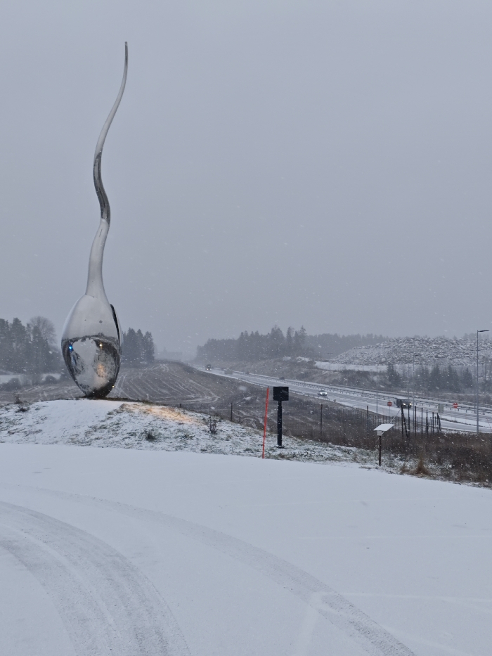 The image depicts a snow-covered winter scene in Stange, Norway, on an overcast day with visible snowfall. In the midground-left, a large, vertically oriented, highly polished metallic sculpture, stylized to resemble a sperm cell with a long, sinuous tail, stands on a snow-dusted grassy mound. The sculpture's head contains internal illumination, casting a warm yellow-orange glow downward onto the snow and reflecting a blue light internally. Behind the sculpture, a section of tilled earth is visible. To the midground-right, a multi-lane highway (E6) runs diagonally across the frame, showing light vehicle traffic traveling in both directions. The highway shoulders are snow-dusted, and several lamp posts line the road. A wire fence separates the immediate foreground from the highway. A black rectangular signpost with a red vertical marker pole is positioned near the fence. The foreground consists of a flat, unbroken expanse of fresh snow, exhibiting tire tracks curving from the bottom-left towards the center. The background features rolling terrain covered with a mix of snow-dusted coniferous and deciduous trees under a uniformly grey, overcast sky. No individuals are present in the scene.