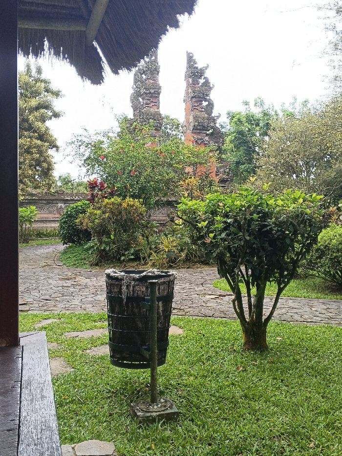 A trash can stands on a grassy lawn, next to a small tree. Behind it, a stone path winds through a garden with various plants. In the distance, ornate, ancient-looking stone structures rise above the greenery, possibly part of a temple or historical site. A thatched roof provides partial cover in the foreground. The scene evokes a sense of tranquility and a blend of nature and cultural heritage.