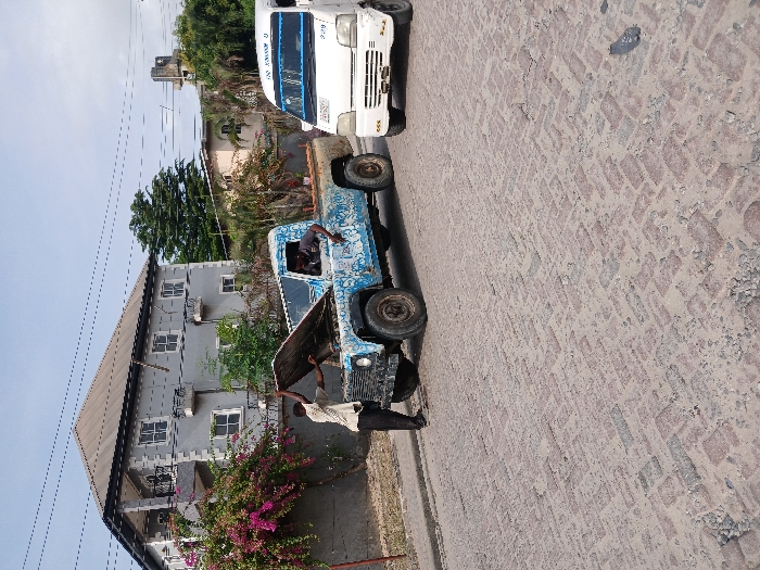 The scene shows two men inspecting a blue, Land Rover Defender parked on a street in Way, Nigeria, which is located at 6.429° N, 3.468° E. The Defender has its hood open and is facing to the right. The street is paved with red bricks, which are cracked and worn down. A white commercial van with its windows rolled up, is parked to the right of the Defender. The van is facing to the left. The van has "God Knows" written on the side. There is a gray, two-story house to the left of the image, with a yard containing shrubs. The house has a black roof and a white concrete wall. The house has windows on the upper story and the ground level. There are power lines and poles running above the street. The scene is taken from a distance and at a slight angle. The weather appears to be clear. The image shows a common scene in Nigeria, where people are often seen repairing vehicles on the side of the road.