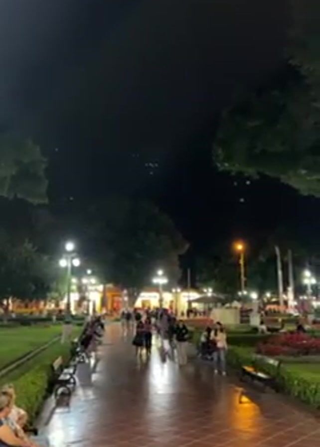 At night, the camera slowly moves through a lit park. The brick path glistens from previous rainfall. The park is full of people, some walking on the path, others sitting on benches. Flower beds are outlined by short, manicured hedges. Trees provide a canopy, and their leaves block the dark night sky. The scene has a peaceful, community vibe.