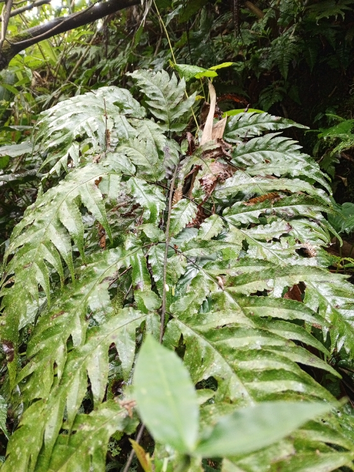 The image presents a close-up, upward-angled view of dense tropical foliage, consistent with a forested area in Silvino Lobos, Philippines. The dominant subject is a large fern with multiple compound fronds, primarily dark green with noticeable lighter green striations and patterns. The fronds appear wet or dewy, exhibiting a slight sheen, and are dotted with numerous small, light-colored specks. Sections of the foliage display areas of brown and reddish-brown, indicating decomposition or older plant matter. A thin, dark stem or vine traverses the central left portion of the frame, diagonally. The background consists of heavily blurred green vegetation and darker, obscured areas, suggesting dense undergrowth and shadows. Out-of-focus green leaves are visible in the immediate foreground, partially obscuring the lower edge of the primary subject. No individuals, animals, or man-made objects are present, and no specific actions or interactions are depicted.