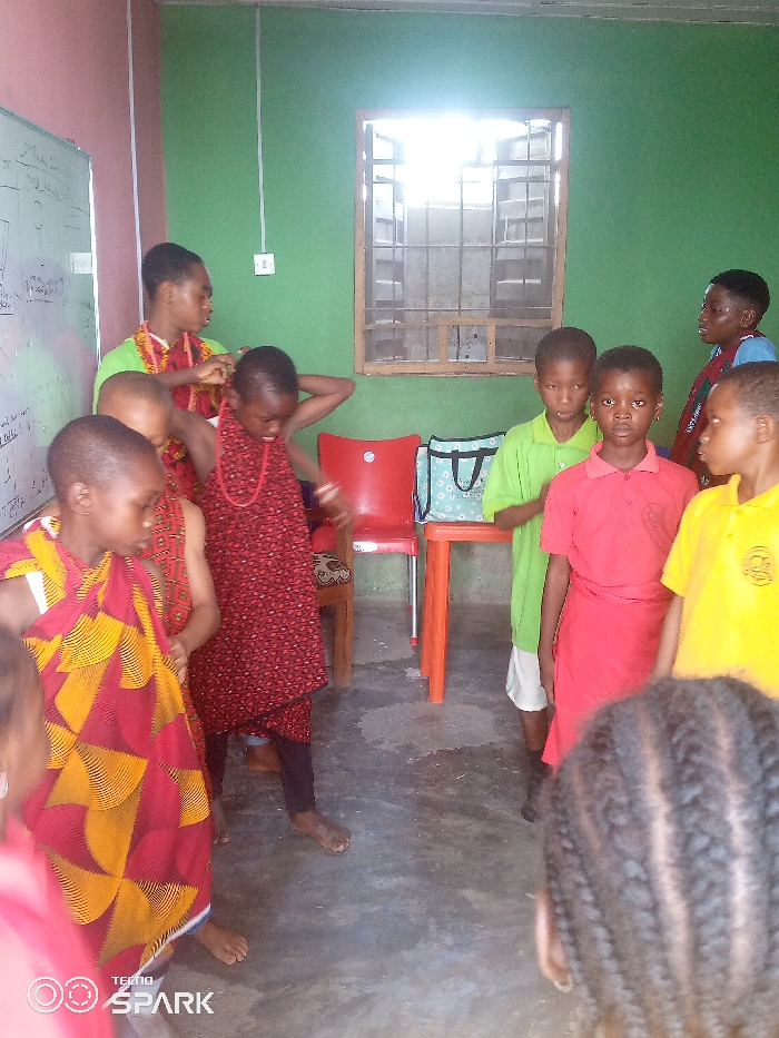 The image depicts an indoor scene in Ajaokuta, Nigeria, featuring at least ten individuals, primarily children and young adults