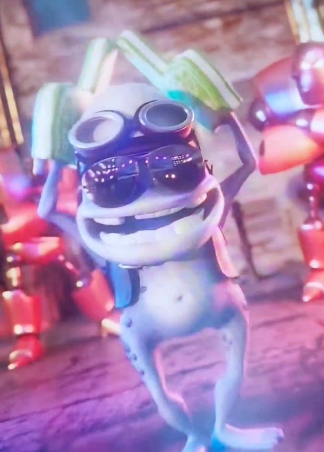 3D animated frog with sunglasses and goggles, holding objects that appear to be rectangular prisms. The frog is wearing a vest and standing in what appears to be a city environment with robots in the background. The lighting is dynamic, with pink and blue hues. The frog moves and changes pose slightly in the video. The sound accompanying the video includes music and vocalizations.