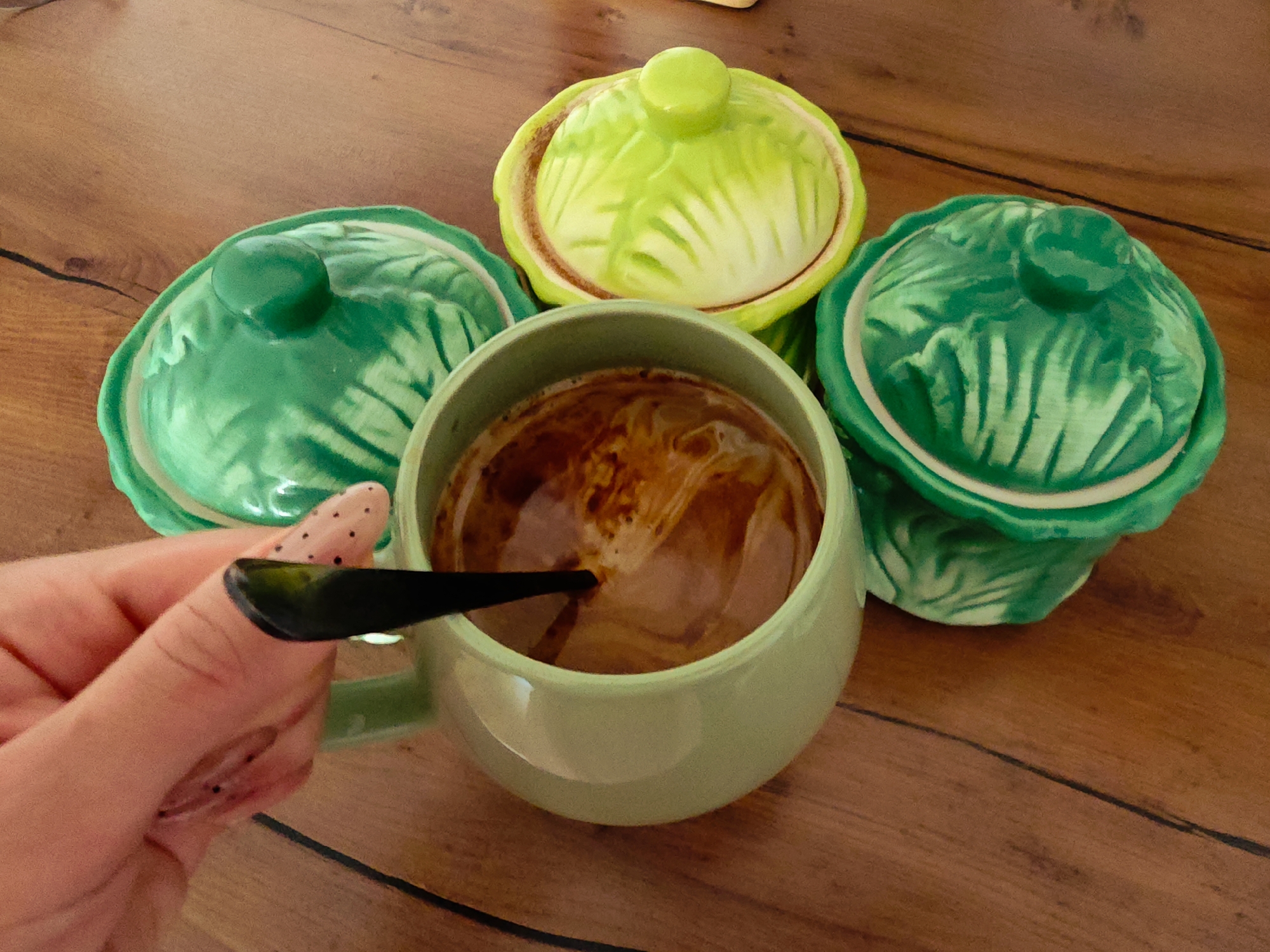 A light green mug filled with a coffee-like beverage is centered on a wooden surface. A hand with painted nails holds a black spoon, positioned to stir the drink. Surrounding the mug are three cabbage-shaped ceramic containers with lids, two in dark green and one in a lighter, yellowish-green. The wooden surface features dark lines and wood grain patterns. There is no information in the image about the location in the city of Chaikovsky, Russia.