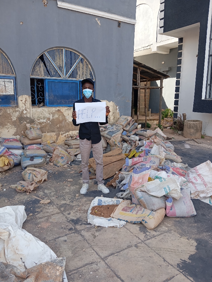 The image depicts an outdoor scene, likely a construction site or storage area between urban structures, illuminated by bright daylight. A single young male stands centrally, facing the camera. He is dressed in a black long-sleeved collared shirt, light tan trousers, and white sneakers, accessorized with a dark baseball cap and a light blue surgical face mask. He holds a white rectangular sign at chest level, on which the word "HELP..." is handwritten in black capital letters. To the left of the subject is a grey-painted building featuring two prominent arched windows with blue frames. The glass in these windows is fragmented or absent, and the lower facade exhibits significant weathering and discoloration. To the right, a section of a modern building with angular design elements and a contrasting light and dark grey exterior is visible. A rustic, dilapidated wooden structure is situated in the background between the two buildings. The ground is composed of dark, irregularly shaped paving stones, largely obscured by a layer of dust and scattered materials. Numerous sacks, identified as cement bags (including brands such as BUA CEMENT and ROYAL CEMENT) and other material bags (e.g., ADMIX, RAW MATERIAL FOR BLENDING), are piled haphazardly across the foreground and midground. Many contain soil, sand, or other aggregates. Pieces of rough-cut lumber, rocks, and general construction debris are interspersed among the sacks. A circular concrete structure is present on the far right. While the materials and architecture suggest an urban Nigerian setting, specific identification of a particular street or district within Jos, Nigeria, is not possible from the visual evidence provided.