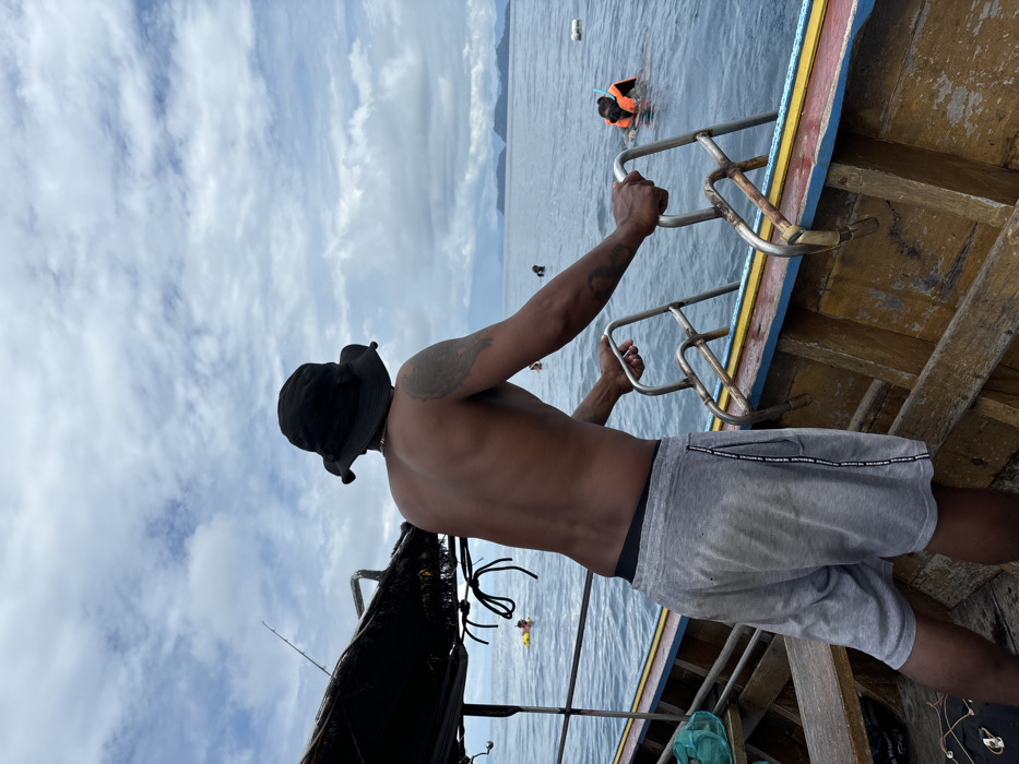 A male subject, seen from the back, stands on a wooden longtail boat in the waters surrounding Ban Ko Li Pe, Thailand