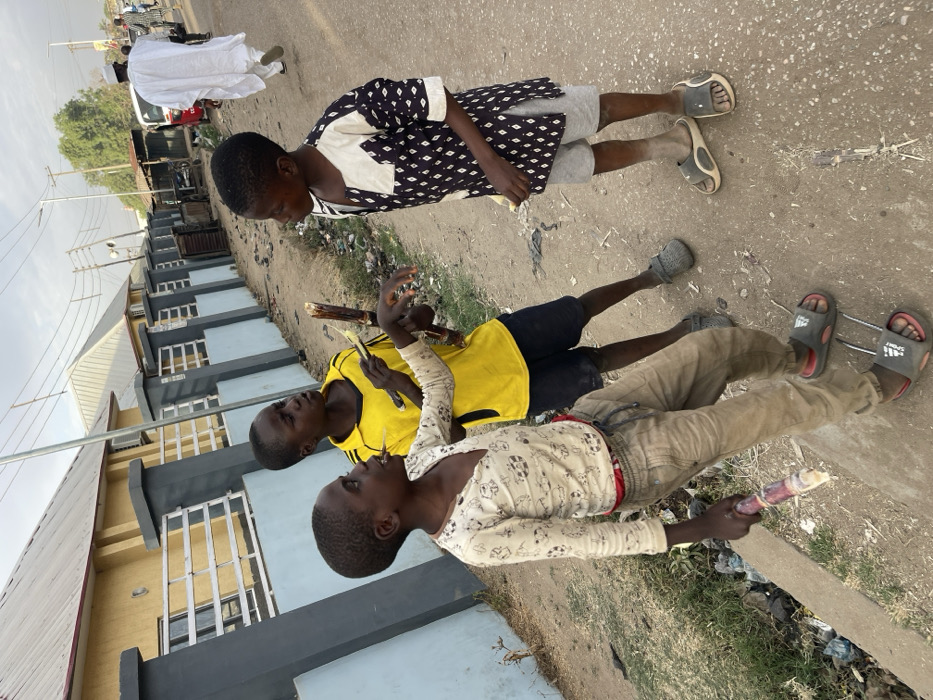 Three young boys stand on a dirt street outside a building, each holding a piece of sugarcane. The boy in the front wears patterned pajamas and sandals, clutching the sugarcane. The boy behind him wears a yellow shirt and shorts, with a piece of sugarcane in his hand. The third boy, at the top of the frame, wears a patterned black and white shirt. Garbage lines the street. In the background, a building stands along with a few cars and pedestrians.