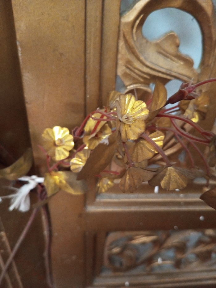 A close-up captures an ornate gold frame or sculpture adorned with gilded floral details