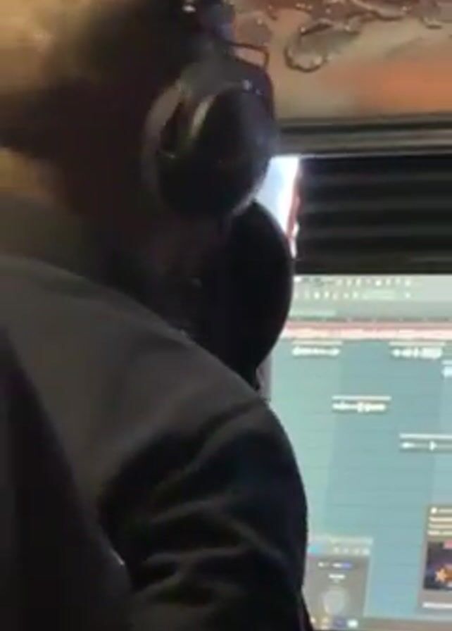 A person is visible from the side, wearing headphones and working in a recording studio. The person has dark skin and is wearing a dark gray shirt. They are positioned in front of a computer monitor displaying audio editing software. In the background is a wall with textured artwork. The person is likely involved in music production or sound engineering. The overall environment appears to be a home recording studio.